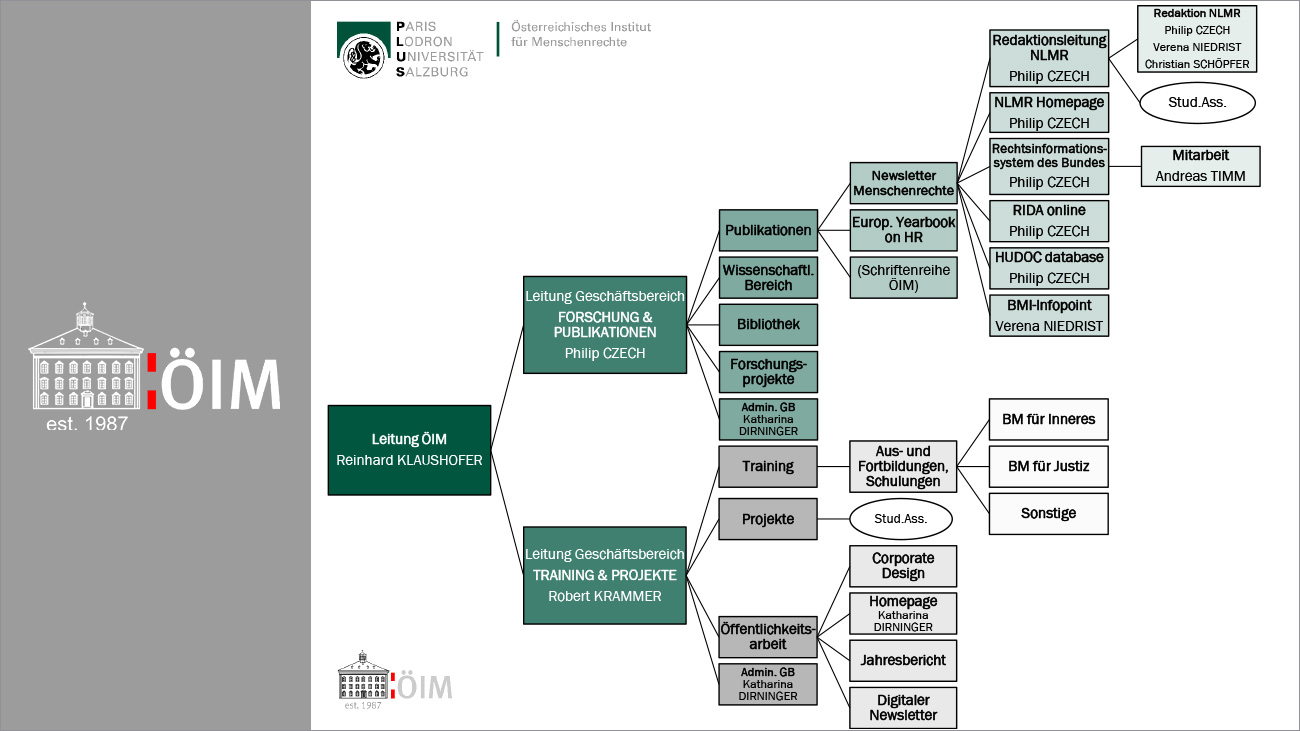 Das Österreichische Institut für Menschenrechte (ÖIM) gliedert sich in zwei Geschäftsbereiche. Dem Geschäftsbereich „Forschung & Publikationen“ obliegen die wissenschaftlichen Agenden des Instituts, insbesondere Herausgabe und Redaktion der Fachzeitschrift „Newsletter Menschenrechte“ sowie deren Verbreitung über gängige Rechtsdatenbanken und die Mitarbeit am „European Yearbook on Human Rights“. Weiters nimmt der Geschäftsbereich die darüber hinausgehende Publikation wissenschaftlicher Beiträge im Bereich der Grund- und Menschenrechte sowie die Verwaltung der umfangreichen Institutsbibliothek wahr. Der Geschäftsbereich „Training & Projekte“ organisiert und leitet praxisorientierte Aus- und Fortbildungen sowie Schulungen, derzeit vor allem für Beamte und Bedienstete des Bundesministeriums für Inneres, des Bundesministeriums für Justiz und im Rahmen des Curriculums an Pädagogischen Hochschulen. Ferner obliegen dem Geschäftsbereich die Öffentlichkeitsagenden des Instituts.