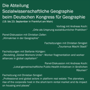 Beim diesjährigen Deutschen Kongress für Geographie, der zwischen 19. und 23. September in Frankfurt am Main stattfindet, beteiligen sich viele unserer Abteilungsmitglieder an Veranstaltungen. Hier ist eine ausführliche Übersicht.