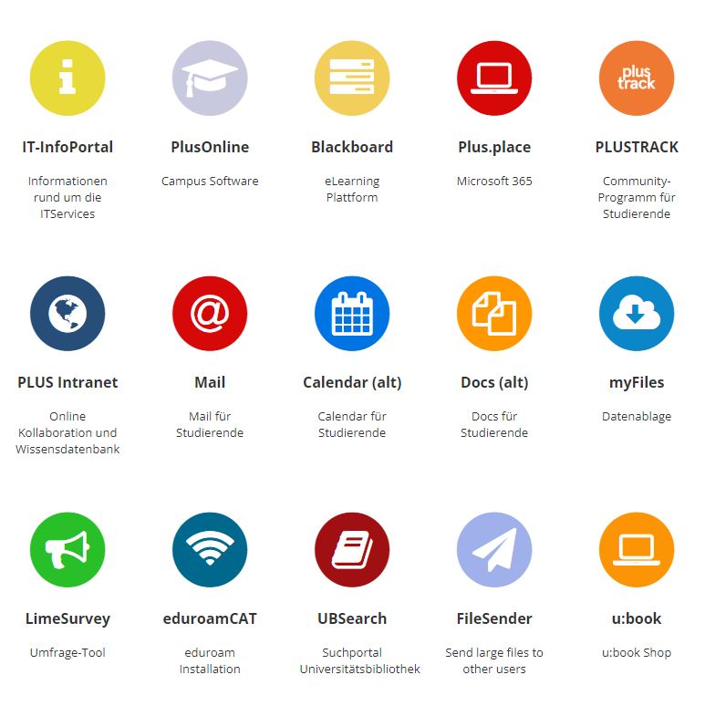 - Viele Anleitungen finden Sie im IT-Info Wiki (über PLUS-Login), z.B. WLAN einrichten, Drucken an der Uni, Studiengebühren online bezahlen usw.