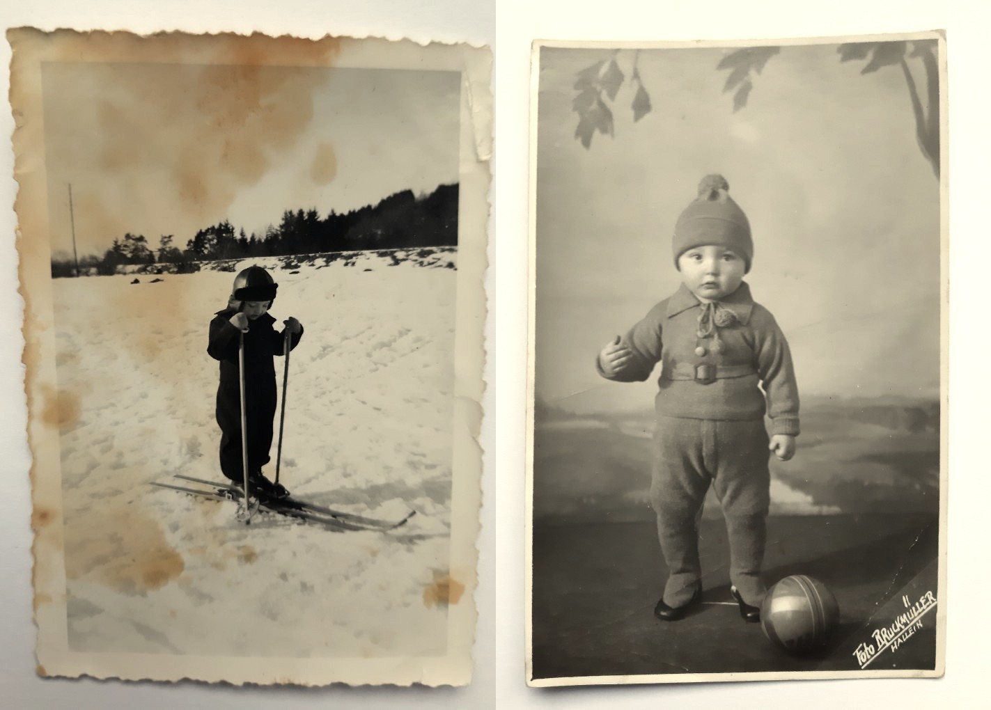 Die Fotos zeigen einmal Herrn Kogelnig bei seiner ersten Ausfahrt auf seinen neuen Schiern nach Weihnachten und einmal mit einem typischen Weihnachtsgeschenk von damals, einen Ball.“