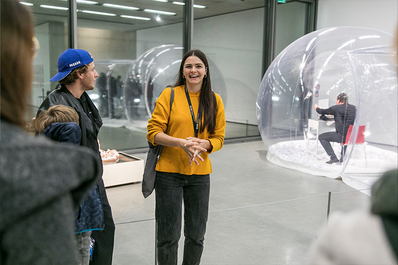 „Unser Mission Statement ist: Kunst für alle, Museum für alle. Das bedeutet auch, dass wir auch barrierefreie Angebote haben. Wir arbeiten z.B. mit Menschen aus der Jugendpsychiatrie, aber auch mit Menschen mit Demenz. Und natürlich sind bei uns auch Touristen und ein sehr kunstaffines Publikum. Unsere Besucher:innen sind ganz unterschiedlich. In der Kunstvermittlung starten wir mit dem Kindergartenalter, wo wir sehr praktisch arbeiten und die Kinder Dinge ausprobieren können, später bieten wir dann auch klassische Führungen an, die auch dialogisch gestaltet sind.“