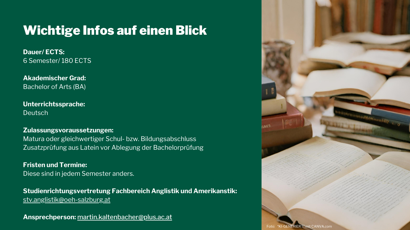 Im Bachelorstudium Anglistik und Amerikanistik an der PLUS erwartet Studierende eine Reise durch die vielfältigen Aspekte der englischsprachigen Welt. Das Studium behandelt die Sprache, Kulturen und Literaturen der anglophonen Länder in deren unterschiedlichen dynamischen Entwicklungen. Den Studierenden werden umfassende Kenntnisse der englischen Sprache vermittelt, sowohl in ihren regionalen Variationen als auch in ihrer globalen Bedeutung.