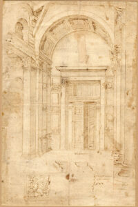 Two pen and ink drawings have been associated with the Raphael School and the Codex Escurialensis, showing the vestibule and interior of the Pantheon, as well as Castel Sant’Angelo and the Pyramid of Cestius.