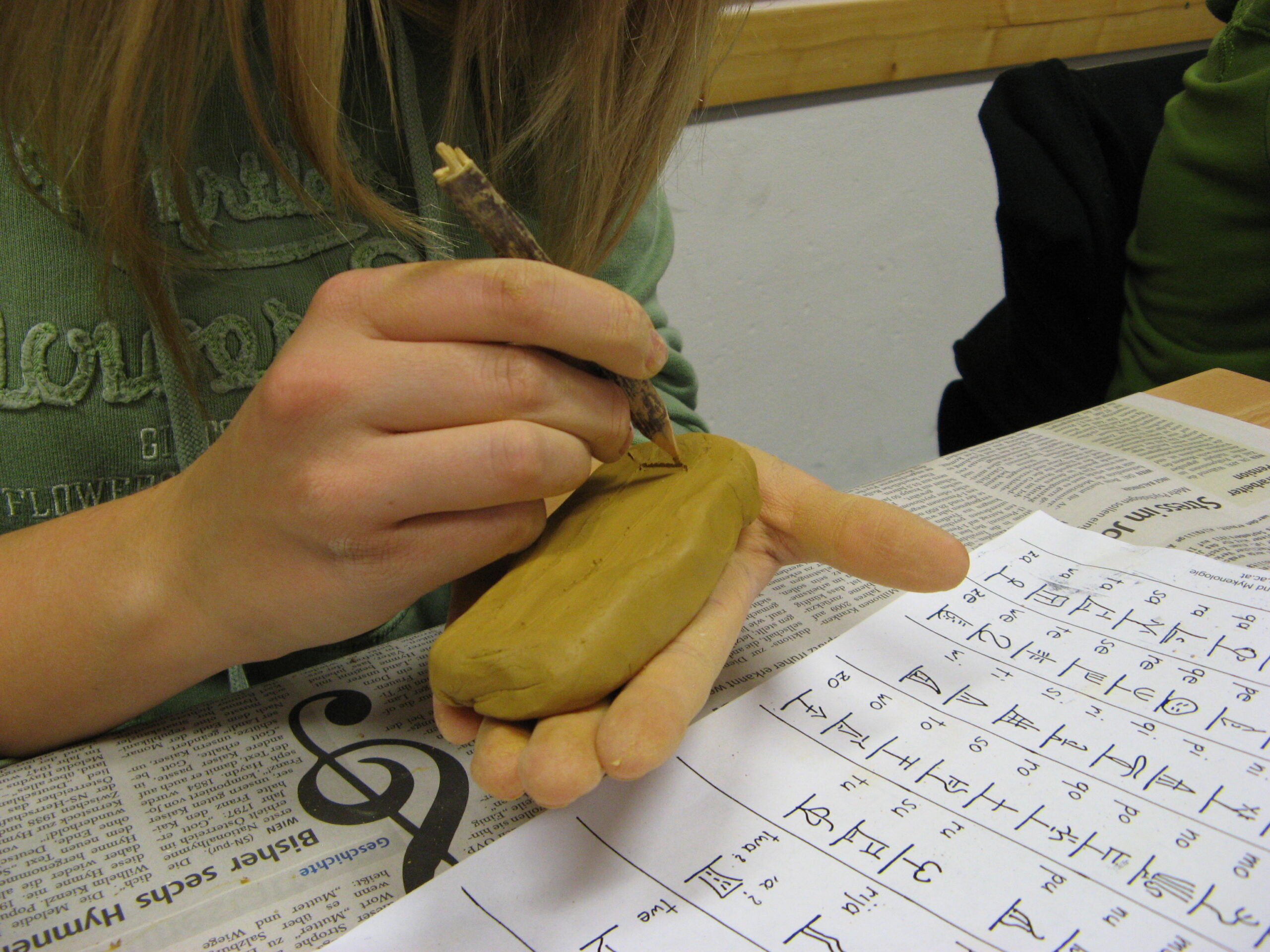 Alle Teilnehmer*innen bekommt einen Klumpen Ton und ein spitzes Holzstäbchen in die Hand. Die Arbeit mit den eigenen Händen leitet ganz von allein in das Thema ein und lässt die vermeintlichen Hürden wie „alte Schrift“, „Universität“, „uralt“ augenblicklich verschwinden.