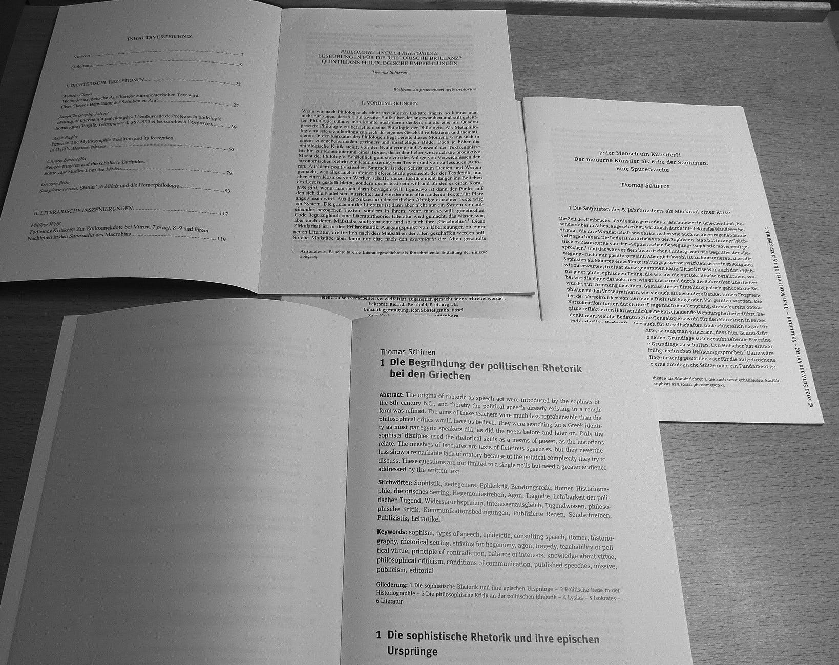 Weise Sprüche zum Essen. Kommunikationsformen beim philosophischen Symposium, in: M. Schauer – J. Zenk (Hrsg.), Text, Kontext, Klartext. Festschrift für Niklas Holzberg zum 70. Geburtstag, Berlin/Boston 2018, 27–62. - Jeder Mensch ein Künstler?! Der moderne Künstler als Erbe der Sophisten. Eine Spurensuche, in: H. Cancik – S. Rebenich – A. Schmid (Hrsg.), Archäologie der Moderne. Antike und AntikeRezeption als Paradigma und Impuls, Basel 2020, 133–176.