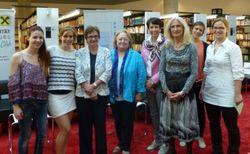 Die Studentinnen Johanna Gutschi und Sarah Baumgartner mit Vizerektorin Sylvia Hahn, Maria Ganauser (Juristin), Alexandra Schwaiger-Hild ( Romanistin), Andrea Reiser (bildende Künstlerin) sowie den Kommunikationswissenschafterinnen Ute Giacomozzi und Jennifer Rödl (Moderatorin)
