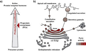 Furthermore, it is crucial for the cell to prevent enzymes, receptors, or growth factors from being activated at the wrong location and/or at the wrong time. Therefore, there are different mechanisms to regulate the activity of the proprotein convertases (PCs). On one hand, PCs are transported to specific compartments of the secretory apparatus. On the other hand, the PCs themselves are synthesized as inactive proproteins and undergo auto-activation at their target compartment. This process involves a series of auto-proteolytic cleavages within the prodomain. The prodomain serves as a sensor that triggers auto-activation once a more or less acidic pH is present in the target compartment. For example, Furin is activated at pH 6.0 in the late Golgi (Fig. 1b). Through transport processes, Furin also reaches secretory vesicles and the cell surface and can be recycled again to the late Golgi.