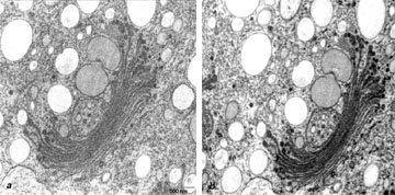 Dictyosomes in Micrasterias. a Elastic brightfield filtered at zero-loss energy. b High contrast image, taken below the carbon specific absorption edge (250 eV). From Lütz-Meindl & Aichinger, 2004.