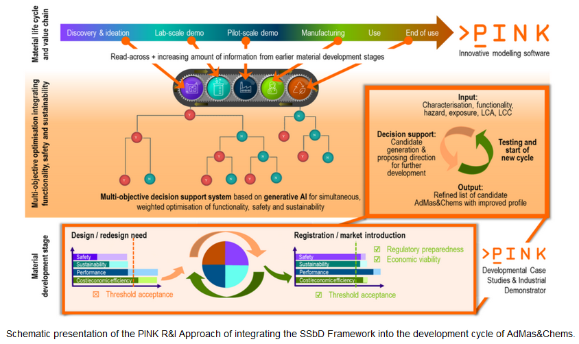 The PINK project, a research and innovation action funded by the EU under the HORIZON Resilience 01-23 call, combines computational models and a decision support system (DSS) that exploit the combined power of first-principles simulation and pre-existing data, which – in itself – is further improved by advanced artificial intelligence (AI) technology; this provides PINK with the capability to significantly decrease the time needed for SSbD Advanced Materials & Chemicals development. However, this requires the integration of tools from different and (hitherto) partly independently developed areas. PINK provides this integration in the form of an open innovation platform, the PINK In Silico Hub (PINKISH) based on an advanced Interoperability Framework, giving access to all information and knowledge, and executing SSbD workflows customisable to (a) the application area of the Advanced Materials & Chemicals, (b) their safety and sustainability concerns of the existing materials, and (c) the status ofthe relevant development project (from early design ideas to registration and market entry).