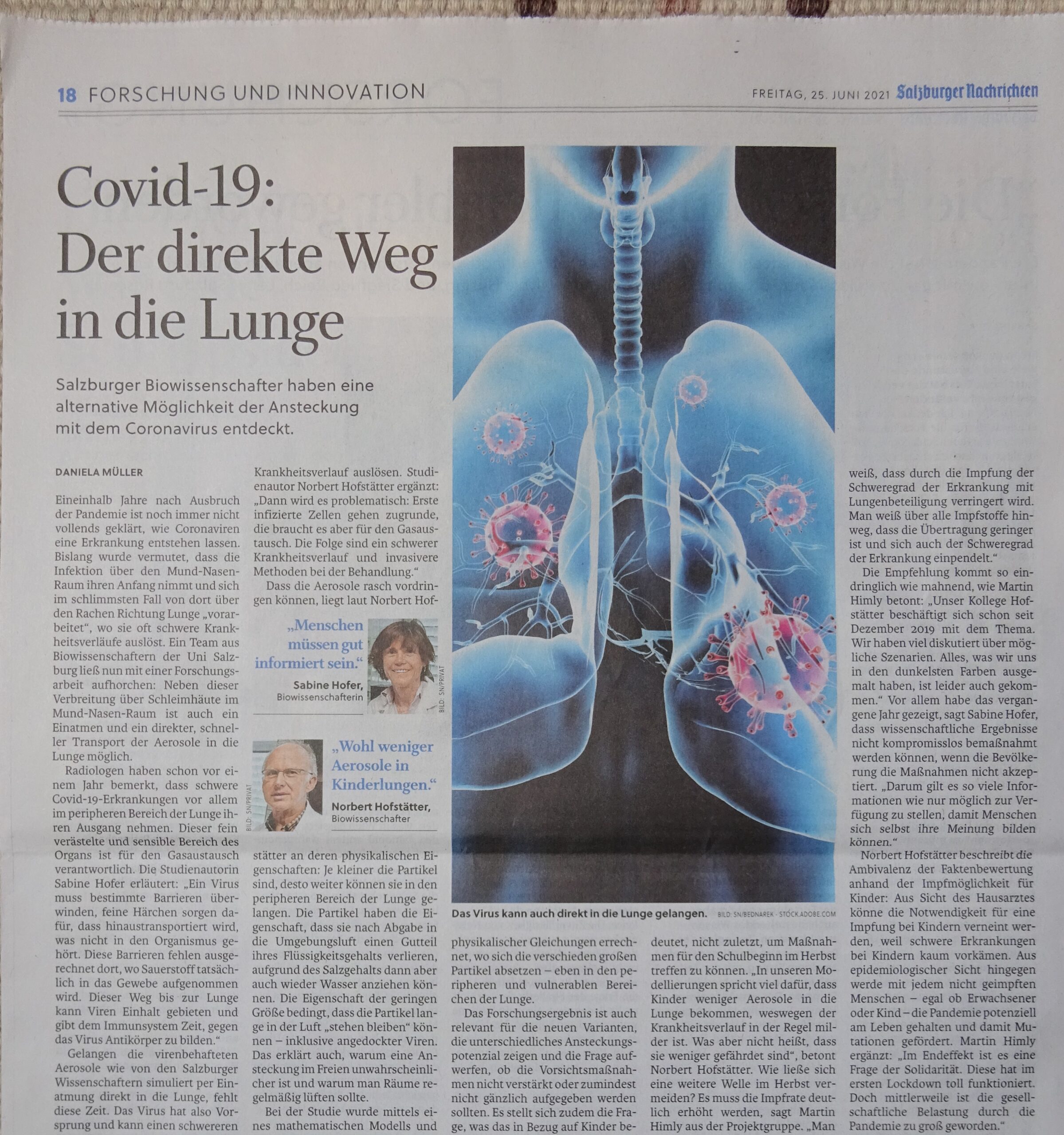 Our research associates Sabine Hofer and Norbert Hofstätter (see below) digged into the pathogenesis of Covid-19 identifying aerosol transmission into the deep lung as critical risk factor for severe courses in disease. Their publication has earned interest by the local press.