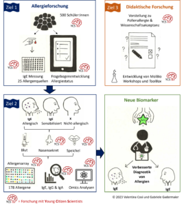 Diese Wissenslücke wird im Projekt durch umfangreiche Antikörpertests in menschlichem Serum, Nasensekret und Speichel geschlossen. Dazu wird die allergenspezifische Bindung verschiedener Antikörper (IgE, IgA und IgG) in den Bioproben der teilnehmenden Young Citizen Scientists genauer untersucht. Ein Allergen-Array, welcher im Miniformat die gleichzeitige Testung von 300 Allergenmolekülen und -extrakten erlaubt, gibt Aufschluss darüber, welche Antikörper in den drei Bioproben zu finden sind. Mittels Massenspektrometrie, einer analytischen Methode zum Nachweis von kleinen Molekülen, wird nach weiteren diagnostischen und protektiven Markern gesucht, die eine Unterscheidung von allergischen, sensibilisierten und nicht-allergischen Personen ermöglicht.