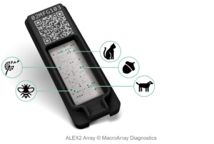Hier dargestellt ist ein Allergenarray (ALEX2 Array von Macro Array Diagnostics), das spezifische IgE-, IgG- und IgA-Antikörper gegen ca. 300 Allergene detektiert. Symbolisch dargestellt sind Allergene stammend von Katzen, Nüssen, Hunden, Pollen und Insektengift.