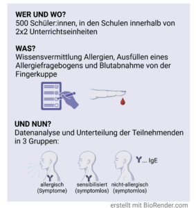 - Zu Beginn des ersten Schulbesuchs wird von allen Teilnehmenden ein kurzer Fragebogen zu Wissenschaftsakzeptanz ausgefüllt. Danach wird der Ablauf des Projekts und Grundlegendes zu Allergien, Allergiediagnose und Antikörpertests erklärt. Zusätzlich wird wissenschaftliches Arbeiten anhand eines molekularbiologischen Beispiels erarbeitet.