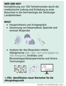 - Mit den Bioproben werden zusätzlich Experimente zur Aviditäts- und Blockierkapazität von IgG- und IgA-Antikörpern, sowie Omics- und ELISA-Analysen durchgeführt um Unterschiede zwischen allergischen, sensibilisierten und nicht-allergischen Personen zu evaluieren.