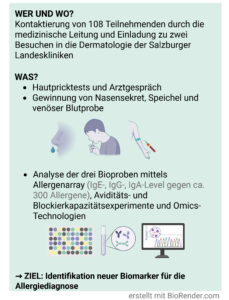 Parallel zur Blutabnahme füllen die Teilnehmenden einen Online Allergiefragebogen aus, der Auskunft über persönliche Daten (z.B. Alter, Geschlecht, Lebensumstände und -gewohnheiten…) gibt, sowie gegebenenfalls Informationen zu vorhandenen Allergien liefert. - Die Studie verläuft pseudonymisiert, das heißt Proben und Daten werden durch einen Code einer Person zugeordnet. In Studienphase 1 füllen die Teilnehmenden ein Kontaktformular aus, auf dem der Code sowie Name und Kontaktdaten angegeben sind. Dieses Formular wird separat in der Dermatologie der Salzburger Landeskliniken aufbewahrt und dient ausschließlich der Kontaktaufnahme für Studienphase 2. Alle erhobenen Daten werden in aggregierter Form analysiert und publiziert, wobei kein Rückschluss auf einzelne Personen möglich ist.