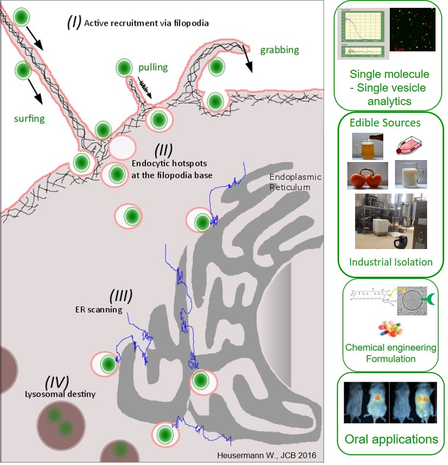 Exosomen sind natürlich vorkommende extrazelluläre Nanovesikel (EV), die von allen Zellen, in allen Königreichen des Lebens ausgeschieden werden. Sie spielen eine wesentliche Rolle in der zellulären Kommunikation und modulieren die Funktion ihrer Empfängerzellen durch funktionellen Transfer von Makromolekülen über Zell- und Gewebebarrieren hinweg. Im Gegensatz zu den meisten synthetischen Wirkstoff-vehikeln werden Exosomen von den Empfängerzellen durch ihre Filopodien aktiv rekrutiert und effektiv in Endosomen internalisiert, die in ihrer quantitativen Effektivität an die von Viren und anderen hochinfektiven Krankheitserregern herankommt (Heusermann W et al, JCB 2016). Innerhalb der Zellen shutteln sie als intakte Vesikel innerhalb von Endosomen, die in einer Stop-and-Go-Bewegung entlang des endoplasmatischen Retikulums scannen, bevor sie zum Abbau in das lysosomale Kompartiment geleitet werden.