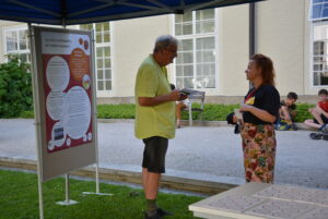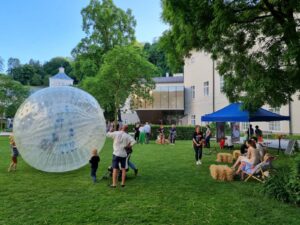 Bei der Langen Nacht der Forschung hatten 1400 Besucher die Möglichkeit sich als riesiges Nanovesikel verpacken zu lassen. Mit Unterstützung unseres tollen Teams konnte man außerdem Vesikel aus frischgepresstem Zitronensaft oder Bier isolieren. 🍋🍺Angenommen du wärst ein 100nm Vesikel: wie weit müsstest du in unserem 3m Zorbing Ball rollen, um in die nächste Zelle zu gelangen? Wie weit wäre deine Reise um vom Magen ins Gehirn zu gelangen?