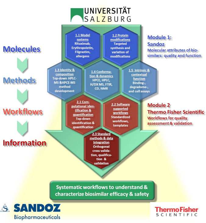 Upon joining expertise at the University of Salzburg in protein production and characterization, bioanalytical chemistry, synthetic chemistry, and structural biology, this research project aims at developing innovative characterization tools for biosimilarity, using and combining highly informative technologies and methods such as high-performance liquid chromatography (HPLC), high-performance capillary electrophoresis (HPCE), mass spectrometry (MS), multistage mass spectrometry (MS/MS), crystallography, chemical synthesis, and biological assays. Novartis, the largest pharmaceutical company in Austria, has established renowned competence centers in Austria, making Novartis a worldwide leader and the preferred collaboration partner in the production and marketing of biosimilars. Thermo Fisher Scientific, one of the global leaders for providing most of the technologies that will be utilized by the team in protein characterization, is also joining the research project, which sets to project on a solid instrumental, methodological, and (bio-)informatic basis.