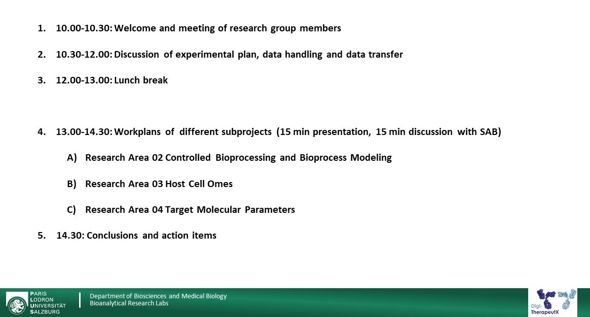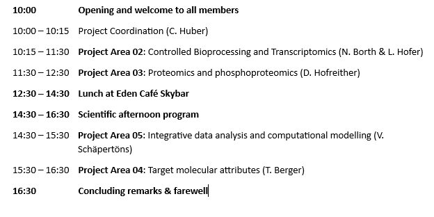 The annual plenary meeting of the Integrated Digitalized Production of Protein Therapeutics: Linking Molecular Attributes to Process Optimization via Digital Twins (KFG 83 N) was held on February 20, 2024 between 10:00 and 17:00, in the Dekanatssitzungssaal, Department of Biosciences & Medical Biology, University of Salzburg. The whole meeting was open for attendance to both the project members and the scientific advisory board members.
