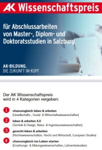 The master thesis on the effect of agility on worker satisfaction (original title: Einfluss von Agilität auf die Arbeitszufriedenheit) by Teresa Doll was awarded the science prize by the Chamber of Labour Salzburg (Arbeiterkammer Salzburg). The master thesis of Teresa Doll was supervised by Isabella Scheibmayr from the HRM group and empirically investigated the effects of agility (agile practices as well as agile organization culture) on worker satisfaction in the IT sector.