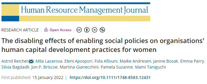 Astrid Reichel, as the first author, together with Mila Lazarova (CAN), Eleni Apospori (GR), Fida Afiouni (LB), Maike Andresen (Ger), Janine Bosak (IR), Emma Parry (GB), Silvia Bagdadli (I), Jon P. Briscoe (USA), Martina Gianecchini (I), Pamela Suzanne (AR), and Mami Taniguchi (JP) shows that social policies aiming at enabling gender equality can actually have opposite effects. Analyzing the 5C data set the researchers show that more parental leave and more public childcare are actually negatively related to organizations’ investment in women’s human capital.