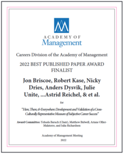 At the Academy of Management 2022 in Seattle, a joint paper from 5C (Cross Cultural Cooperation on Contemporary Careers) was selected as one of two papers that the jury found to be the best of all papers published in the field of career research 2021! Astrid Reichel is part of the team of authors who developed a scale for measuring career success.