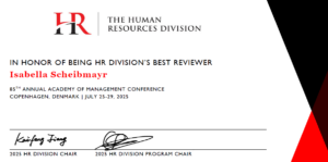 Isabella Scheibmayr wurde für ihr Engagement als beste Reviewerin der HR Division für das 85. Academy of Management Meeting in Copenhagen ausgezeichnet.