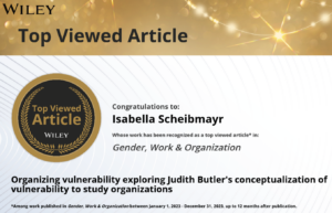 Der Artikel “Organizing vulnerability – exploring Judith Butler’s conceptualization of vulnerability to study organizations” von Isabella Scheibmayr wurde durch das Journal „Gender, Work & Organization“ als einer der Top 10% Artikel des Jahres (2023) ausgezeichnet.