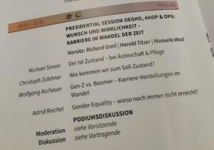 Von 24.4. -26.4.2025 fand im Messezentrum Salzburg die OeGHO- & AHOP-Frühjahrstagung 2025 statt. Es handelt sich um die jährlich größte Zusammenkunft der Österreichischen Gesellschaft für Hämatologie und Medizinische Onkologie. Am 24.4. war Astrid Reichel zu Podiumsdiskussion und Vortrag im Rahmen der Presidential Session „Karriere im Wandel der Zeit“ zum Phänomen der vergeschlechtlichten Zeit in Ärzt:innenkarrieren eingeladen.