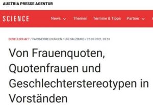 Astrid Reichel im Gespräch mit Stephanie Rausch über Frauenquoten und Quotenfrauen der Podcast-Reihe. „Die gefragte Frau“ der Salzburger Nachrichten. Nachzuhören HIER.Bereits am 23.4. widmete sich die SN dem Thema Geschlechterstereotype und Frauenqoute in einem ausführlichen Beitrag: