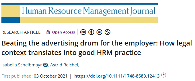 Der Artikel “ Beating the advertising drum for the employer: How legal context translates into good HRM practice” von Isabella Scheibmayr und Astrid Reichel ist in der Zeitschrift Human Resource Management Journal (HRMJ) erschienen. Der Aufsatz betrachtet, wie HR-Praktiker*innen mit der Einführung von verpflichtenden Entgeltangaben in Stellenausschreibungen umgegangen sind. Die Autorinnen fanden heraus, dass HR-Praktiker*innen durchaus pro-aktiv auf die Novelle des Gleichbehandlungsgesetzes reagiert haben und die Regelung in ihrem Sinne für die HRM-Praxis übersetzt haben.