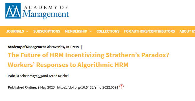 In Kürze wird in der Zeitschrift Academy of Management Discoveries ein Artikel von Isabella Scheibmayr & Astrid Reichel mit dem Titel „The Future of HRM Incentivizing Strathern’s Paradox? Workers’ Responses to Algorithmic HRM” erscheinen. Der Artikel ist bereits vorab hier verfügbar. In dem Beitrag untersuchen Scheibmayr & Reichel wie Menschen auf algorithmisches Personalmanagement, im speziellen auf automatisierte Personalevaluation, reagieren.