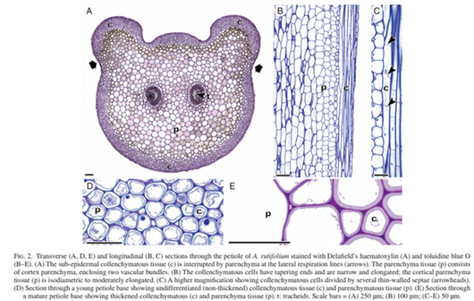 • Background and Aims A key structural adaptation of vascular plants was the evolution of specialized vascular and mechanical tissues, innovations likely to have generated novel cell wall architectures. While collenchyma is a strengthening tissue typically found in growing organs of angiosperms, a similar tissue occurs in the petiole of the fern Asplenium rutifolium.