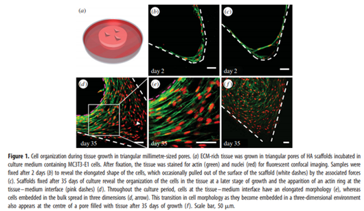 The complex arrangement of the extracellular matrix (ECM) produced by cells during tissue growth, healing and remodelling is fundamental to tissue function. In connective tissues, it is still unclear how both cells and the ECM become and remain organized over length scales much larger than the distance between neighbouring cells. While cytoskeletal forces are essential for assembly and organization of the early ECM, how these processes lead to a highly organized ECM in tissues such as osteoid is not clear. To clarify the role of cellular tension for the development of these ordered fibril architectures, we used an in vitro model system, where pre-osteoblastic cells produced ECM-rich tissue inside channels with millimetre-sized triangular cross sections in ceramic scaffolds. Our results suggest a mechanical handshake between actively contracting cells and ECM fibrils: the build-up of a long-range organization of cells and the ECM enables a gradual conversion of cell-generated tension to pre-straining the ECM fibrils, which reduces the work cells have to generate to keep mature tissue under tension.