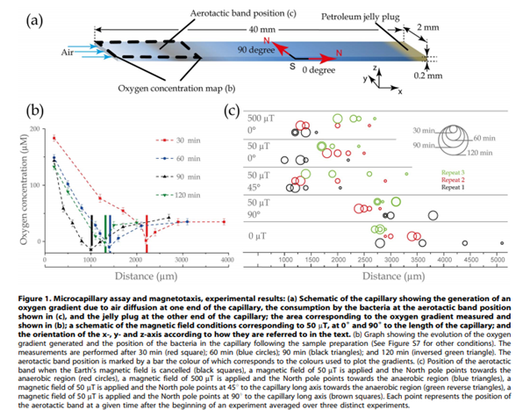 The response of cells to changes in their physico-chemical micro-environment is essential to their survival. For example, bacterial magnetotaxis uses the Earth’s magnetic field together with chemical sensing to help microorganisms move towards favoured habitats. The studies of such complex responses are lacking a method that permits the simultaneous mapping of the chemical environment and the response of the organisms, and the ability to generate a controlled physiological magnetic field. We have thus developed a multi-modal microscopy platform that fulfils these requirements. Using simultaneous fluorescence and high-speed imaging in conjunction with diffusion and aerotactic models, we characterized the magneto- aerotaxis of Magnetospirillum gryphiswaldense. We assessed the influence of the magnetic field (orientation; strength) on the formation and the dynamic of a micro-aerotactic band (size, dynamic, position). As previously described by models of magnetotaxis, the application of a magnetic field pointing towards the anoxic zone of an oxygen gradient results in an enhanced aerotaxis even down to Earth’s magnetic field strength. We found that neither a ten-fold increase of the field strength nor a tilt of 45u resulted in a significant change of the aerotactic efficiency. However, when the field strength is zeroed or when the field angle is tilted to 90u, the magneto-aerotaxis efficiency is drastically reduced. The classical model of magneto-aerotaxis assumes a response proportional to the cosine of the angle difference between the directions of the oxygen gradient and that of the magnetic field. Our experimental evidence however shows that this behaviour is more complex than assumed in this model, thus opening up new avenues for research.