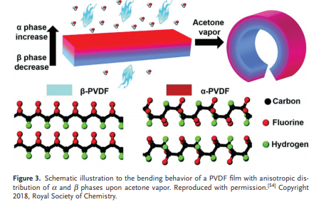 Inspired by the motions of plant tissues in response to external stimuli, significant attention has been devoted to the development of actuating polymeric materials. In particular, polymeric actuators driven by organic molecules have been designed due to their combined superiorities of tunable functional monomers, designable chemical structures, and variable structural anisotropy. Here, the recent progress is summarized in terms of material synthesis, structure design, polymer–solvent interaction, and actuating performance. In addition, various possibilities for practical applications, including the ability to sense chemical vapors and solvent isomers, and future directions to satisfy the requirement of sensing and smart systems are also highlighted.