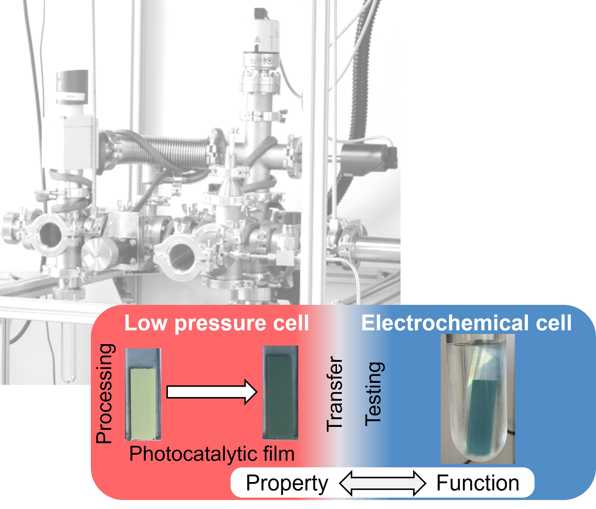 To study processes at solid/liquid interfaces we apply and develop advanced in situ characterization methods. Examples include the use of electrochemical impedance spectroscopy, IR- and UV/Vis-spectroscopy to study bias- or light-induced processes at the semiconductor/electrolyte interface. Only recently, a dedicated reactor system was developed, which allows (i) to process nanostructured oxide films in defined gas atmospheres in a low pressure chamber (activation/processing cell) and (ii) to transfer the processed samples under inert conditions (i.e. without passing through the ambient atmosphere) into a liquid electrolyte solution and use them as electrodes in a (photo)electrochemical cell (high pressure chamber). The impact of processing-induced property changes on electrode performance can thus be studied in a systematic way. This has been exploited, for instance, to elucidate, how the photoelectrocatalytic activity of WO3 and TiO2 nanoparticle electrodes can be optimized via chemical reduction of the semiconductors by atomic hydrogen.