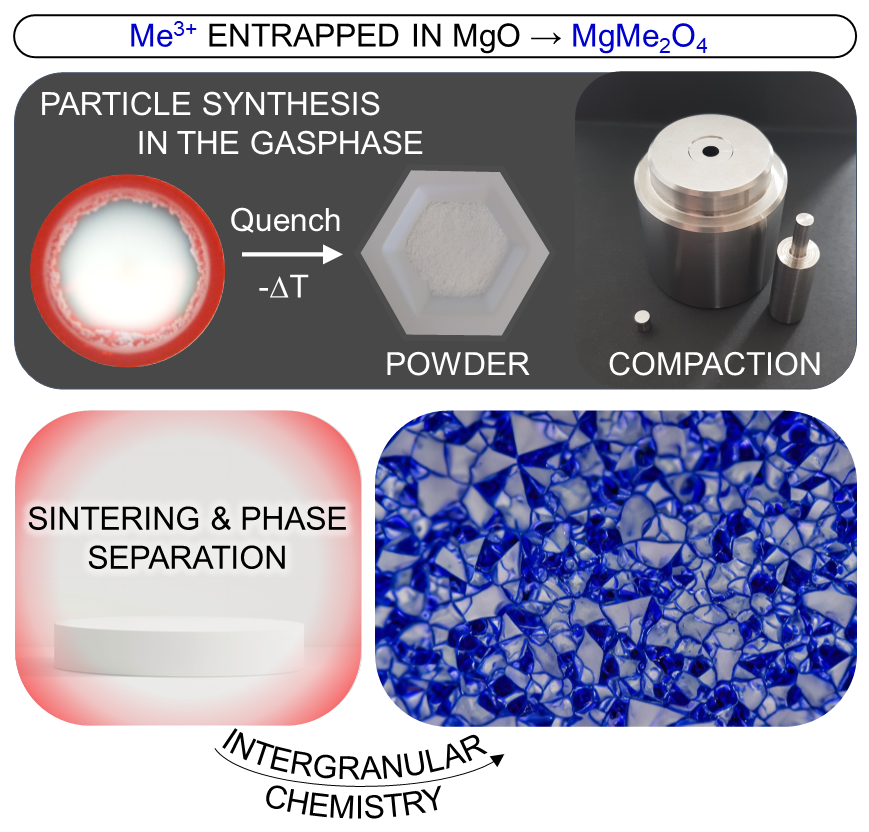 Schematic description of our approach towards functional material properties with designed intergranular regions. Starting with the introduction of impurities during gas phase synthesis of particles, involves dedicated processing protocols to control segregation and interface chemistry at different length scales and thus the dispersion of admixtures inside the ceramic microstructure. © Thomas Schwab