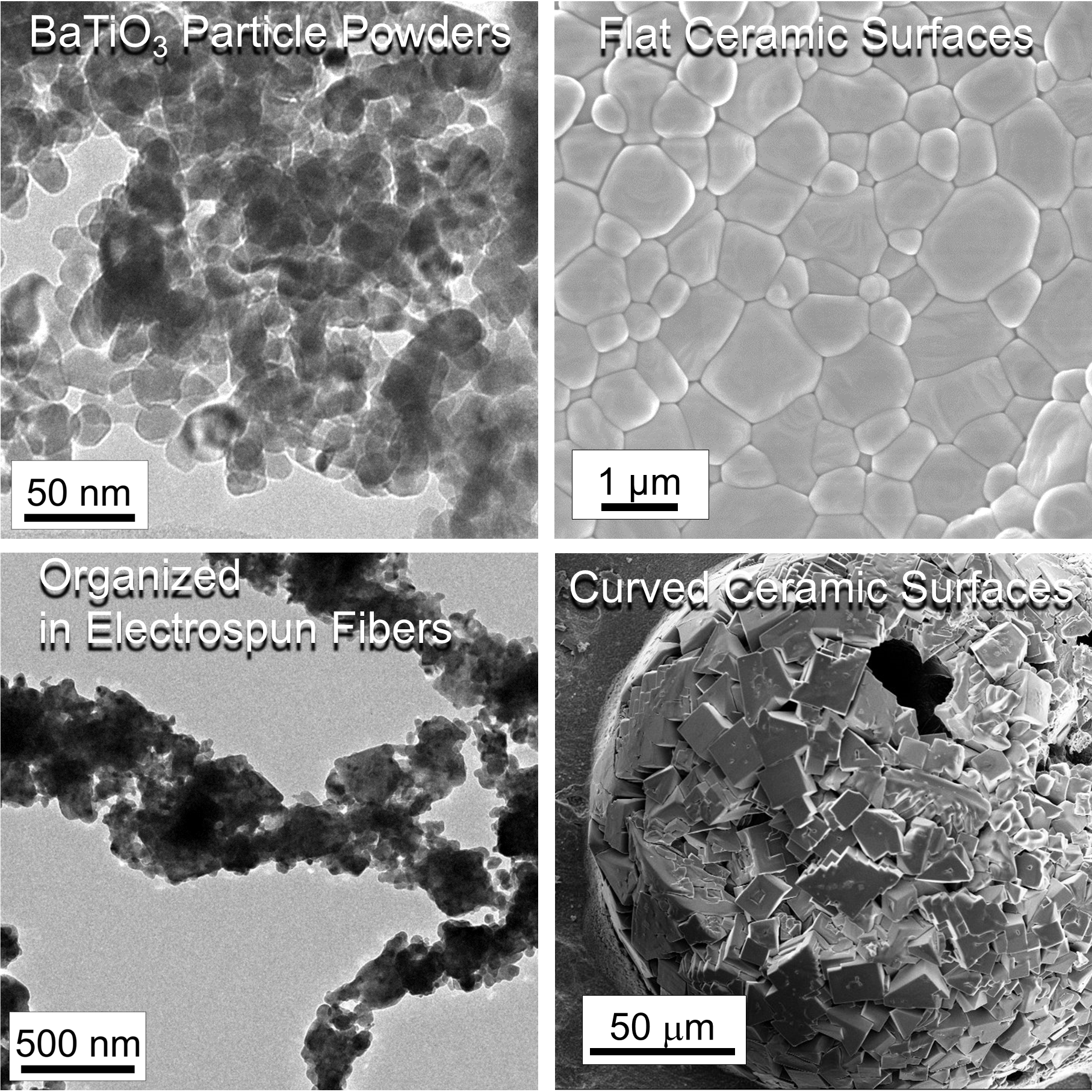 Nanoparticle powders with high specific surface areas and tunable densities correspond to a real-life system, quite representative of what the industry could mass-produce. High surface area nanofibers or sintered and coarsened BaTiO3 nanoparticle structures are analyzed with regard to their ferroelectricity-assisted charge separation properties.