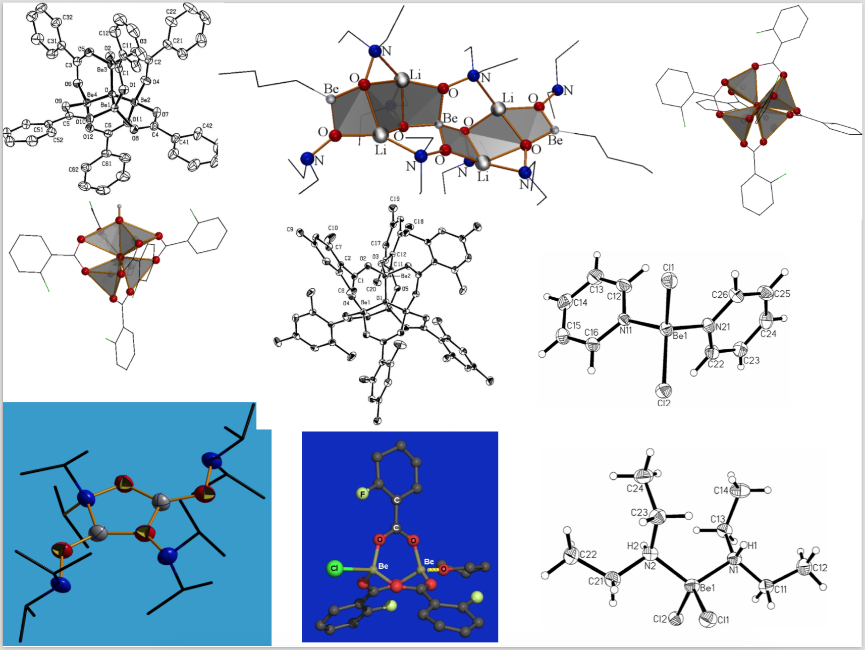 Selected solid state structures (XRD) from previously unknown beryllium compounds I have prepared and characterised for the first time. References are to be found (from left to right, top to bottom) in:
