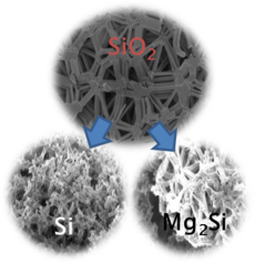 Silicon and its alloys are of interest in energy storage (lithium ion batteries) and energy conversion systems (thermoelectric materials). Highly porous silica is a promising source for the preparation of silicon and silicon alloys, such as LiSi or MgSi alloys. Our aim is to develop novel and reproducible synthesis protocols towards these materials with special emphasis on the optimization of the structural properties of “nano” silicon and its alloys.