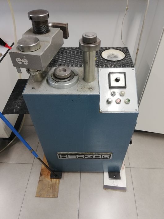 Funktionsweise: Die Presse wird verwendet, um Gesteinsmehl von etwa 10 Gramm in Tablettenform zu pressen und die Probe darauf in der RFA zu analysieren.