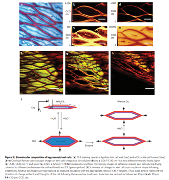 Actuated plant materials are a source of inspiration for the design of adaptive materials and structures that are responsive to specific external stimuli. Hydro-responsive, metabolismindependent plant movements are particularly fascinating, because the extracted concepts are more amenable to transfer into engineering than those dependent on cellular activity. Here we investigate the structural and compositional basis of a sophisticated plant movement mechanism—the hydration-dependent unfolding of ice plant seed capsules. This reversible origami-like folding pattern proceeds via a cooperative flexing-and-packing mechanism actuated by a swellable cellulose layer filling specialized plant cells. Swelling is translated into a bidirectional organ movement through simple geometric constraints embedded in the hierarchical architecture of the ice plant valves. Extracted principles from this reliable and reversible actuated movement have relevance to the emerging field of ‘programmable matter’ with applications as far-reaching as the design of satellites and artificial muscles.
