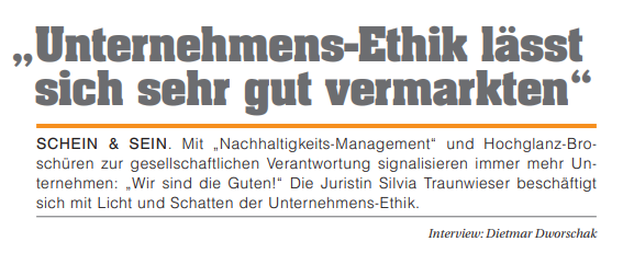In the October edition 05/21 of the professional journal Anwalt Aktuell, Dr. Silvia Traunwieser gave an interview that deals with the light and dark sides of business ethics. It also addresses issues such as home-office, corruption, whistleblowing and human dignity in the 21st century. You can find the article under: https://www.anwaltaktuell.at/ausgabe-05-21/unternehmens-ethik-l%C3%A4sst-sich-sehr-gut-vermarkten/
