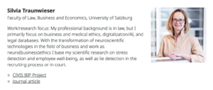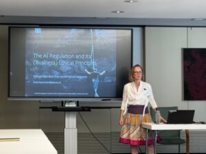Dr. Traunwieser gave a presentation titled “The AI Regulation and its (Business) Ethical Principles – Ethical Risks and their Potential Acceptance.” In her talk, she explored the ethical challenges posed by the European AI Regulation, particularly within a business context. A particular focus of her research is the use of neuroscientific technologies in the workplace. In her current journal article, she critically analyzes the ethical implications of lie detectors in the application process. You can find the article here.