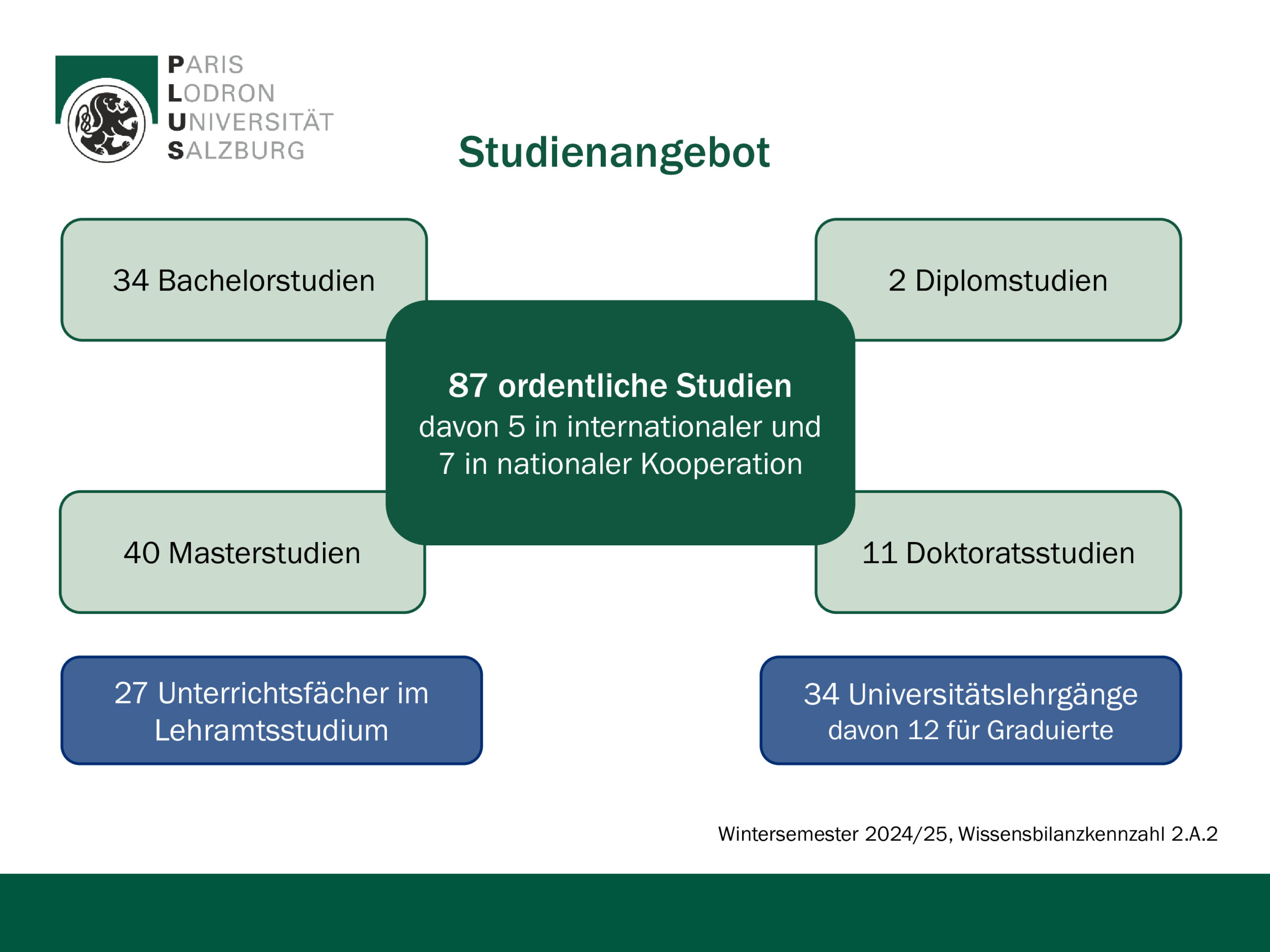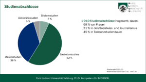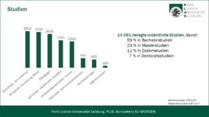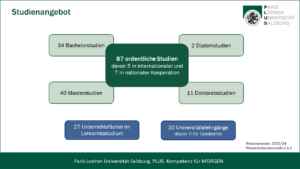 Die Universität Salzburg bietet mit ihren knapp 18.000 Studierenden und fast 3.000 Mitarbeiter*innen als größte Bildungs- und Forschungseinrichtung in Salzburg ein breites Wissensangebot. Sie verfügt über sechs Fakultäten, drei Schwerpunkte und zehn Zentren. Das breite Fächerspektrum der Universität Salzburg reicht von Theologie über Rechts- und Wirtschaftswissenschaften bis hin zu digitalen-analytischen Wissenschaften und Natur- und Lebenswissenschaften sowie Kulturwissenschaften und Gesellschaftswissenschaften. Derzeit sind insgesamt 87 ordentliche Diplom-, Bachelor-, Master- oder Doktoratsstudien eingerichtet. Besonderes Augenmerk wurde in den letzten Jahren auf das Lehramt gelegt, im Verbund Cluster Mitte können 24 Unterrichtsfächer und eine Spezialisierung eingeschrieben werden. Dazu kommt ein umfangreiches Angebot für lebenslanges Lernen in Form von zahlreichen Universitätslehrgängen und der „Uni 55-PLUS“.
