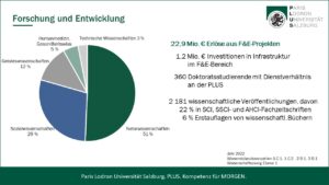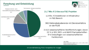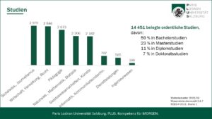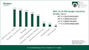 Die Universität Salzburg bietet mit ihren knapp 18.000 Studierenden und fast 3.000 Mitarbeiter*innen als größte Bildungs- und Forschungseinrichtung in Salzburg ein breites Wissensangebot. Sie verfügt über sechs Fakultäten, drei Schwerpunkte und zehn Zentren. Das breite Fächerspektrum der Universität Salzburg reicht von Theologie über Rechts- und Wirtschaftswissenschaften bis hin zu digitalen-analytischen Wissenschaften und Natur- und Lebenswissenschaften sowie Kulturwissenschaften und Gesellschaftswissenschaften. Derzeit sind insgesamt 87 ordentliche Diplom-, Bachelor-, Master- oder Doktoratsstudien eingerichtet. Besonderes Augenmerk wurde in den letzten Jahren auf das Lehramt gelegt, im Verbund Cluster Mitte können 24 Unterrichtsfächer und eine Spezialisierung eingeschrieben werden. Dazu kommt ein umfangreiches Angebot für lebenslanges Lernen in Form von zahlreichen Universitätslehrgängen und der „Uni 55-PLUS“.