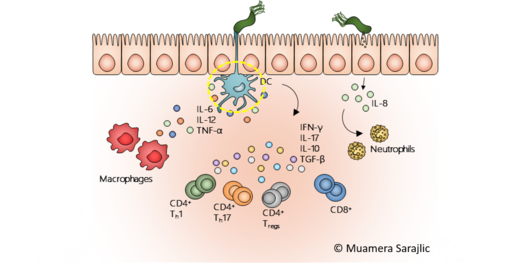 In the past years, I was extensively working on the response of the human immune system to the gastric bacterium Helicobacter pylori. I was focusing on specific immune cells, dendritic cells, which are very efficient in surveilling the body by detecting foreign and dangerous molecules, including bacteria. As Helicobacter pylori manages to evade recognition by the immune system, it successfully persists in humans for decades or even for a life time. The resulting chronic infection forms the basis for different diseases, including gastric cancer. During my doctoral studies, we were able to show that H. pylori employs proteins within dendritic cells to modulate their potential to mount a strong immune response, which would eliminate the bacterium from the body. Hence, our study gives insights in the mechanisms H. pylori might utilize to persist in the body and further promote pathogenesis of gastric diseases and thus, we identified pathways, which could be implemented in future therapeutic strategies to counteract the rising problem of bacterial resistance to antibiotics.