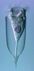 New morphologic and genetic features have been discovered in tintinnid ciliates, microscopic unicellular animals with minute, hair-like appendages, collected in the Mediterranean and North Atlantic. The data contribute to a better understanding of the species limits and the evolution of tintinnids and their relationships. Tintinnids seem to be an important component of the marine planktonic food web as they feed on bacteria and toxic algae and are preyed upon by small multicellular animals (e.g., fish larvae). The main feature of tintinnids is the 20–1000 µm long lorica (house), which is vase-shaped or tubular and has a hyaline (clear) or agglomerated (covered with environmental particles) structure. Since their discovery in the year 1776, about 1200 species in 75 genera and 15 families have been described, using merely lorica features, which turned out to be unsuitable for a natural classification, as species often form different kinds of houses. Reliable features are, however, poorly known, viz., cell morphology and genes have been studied in only 3 % of the species.