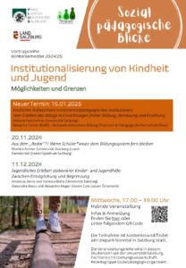 Die gesamte Vortragsreihe ist als Verschränkung von Beiträgen aus Wissenschaft und Praxis konzipiert. Sie wird jeweils mittwochs von 17-19 Uhr an der Universität Salzburg in hybridem Format angeboten.